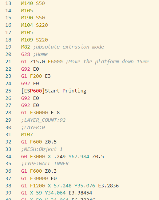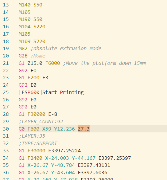 Gcode의 시작 시 20행까지 homing, 노즐과 베드 온도 설정으로 주는 코드가 있고 21행부터 28행까지 익스트루더를 초기화하는 코드가 있으니 29행까지는 살려두고 30행부터 위에서 찾은 20832행까지를 삭제합니다. 수정된 코드는 아래와 같은 모습이 되겠죠.