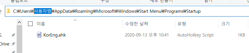이렇게 만든 스크립트는 자동으로 실행되지 않습니다. 컴퓨터를 새로 켜면 그때마다 스크립트를 실행시켜줘야 하는데 불편하죠. 그래서 자동실행되도록 시작프로그램 폴더에 스크립트 파일을 넣어줍니다.