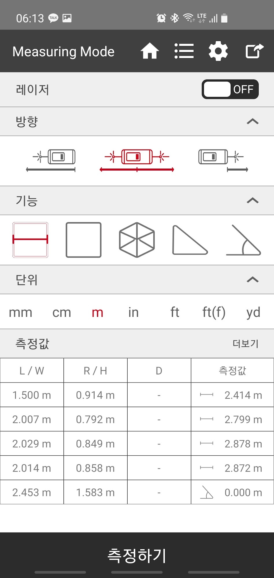 스토어에서 "VH-80 Measuring & Sketch"라는 앱을 찾아서 설치를 하면 "Measuring, Sketch, Calculation" 3가지 모드를 사용할 수 있습니다. Measuring Mode는 말 그대로 측정을 하는 메뉴입니다. 제가 생각했을 때 VH-80의 단점 하나를 꼽으라면 본체의 버튼 4개로 조작하는 인터페이스의 불편함을 들 수 있는데요. 레이저 방향을 선택하고 단위를 바꾸고 하는 등의 조작이 뭔가 불편합니다. 그런데 앱에 연결하게 되면 모든 기능이 한화면에 일목요연하게 들어오기 때문에 쉽게 조작할 수 있습니다. 물론 BT를 연결해야 한다는 불편함은 감수해야 하지만요.