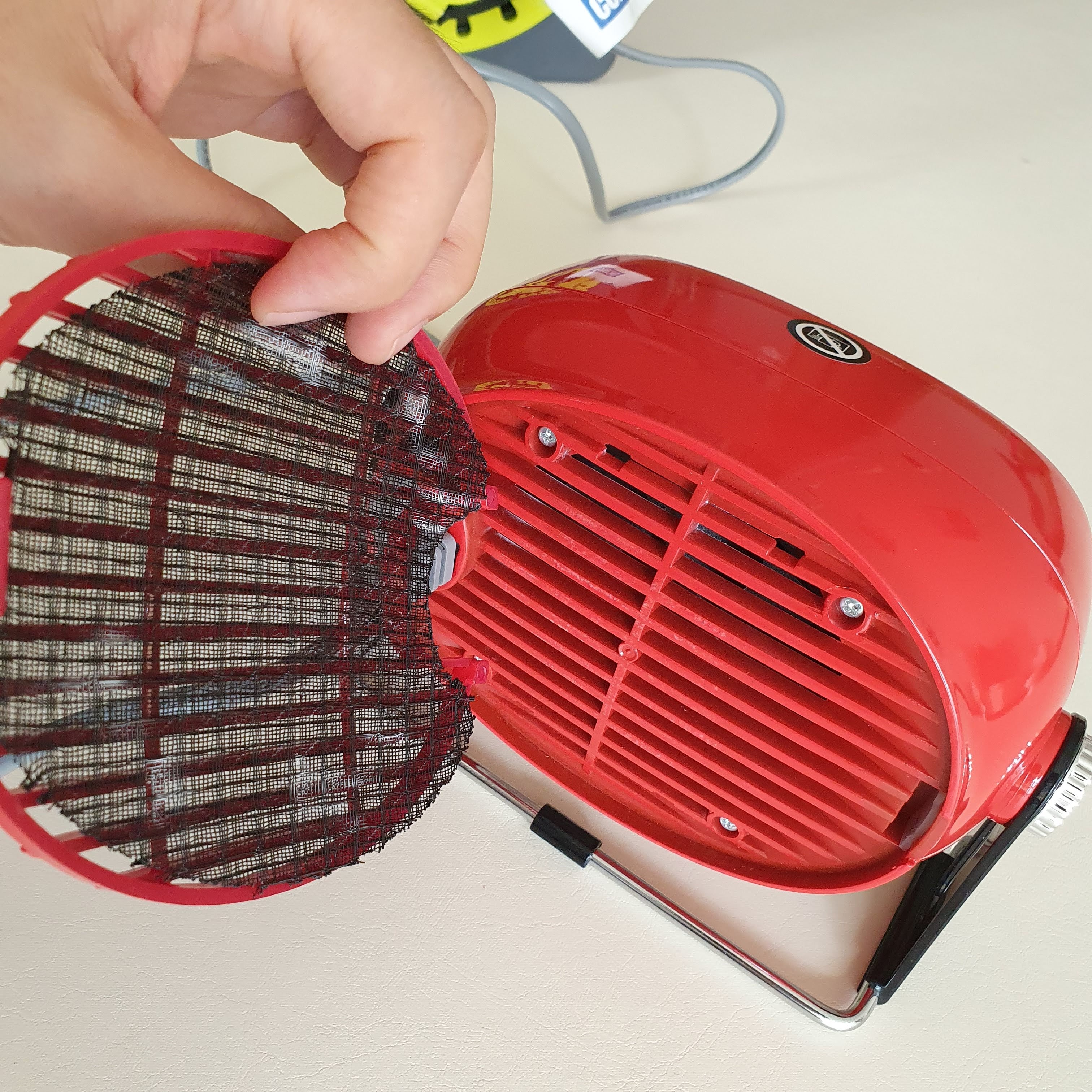 뒷면에는 먼지를 걸러주는 필터가 있습니다. 이물질이 들어가서 화재가 날 수도 있으니 이런 안전장치는 꼭 필요하겠죠. 그리고 그 안으로는 바람을 불어주는 팬이 보이는데요. 흔히 볼 수 있는 컴퓨터 쿨링팬처럼 생겼어요.