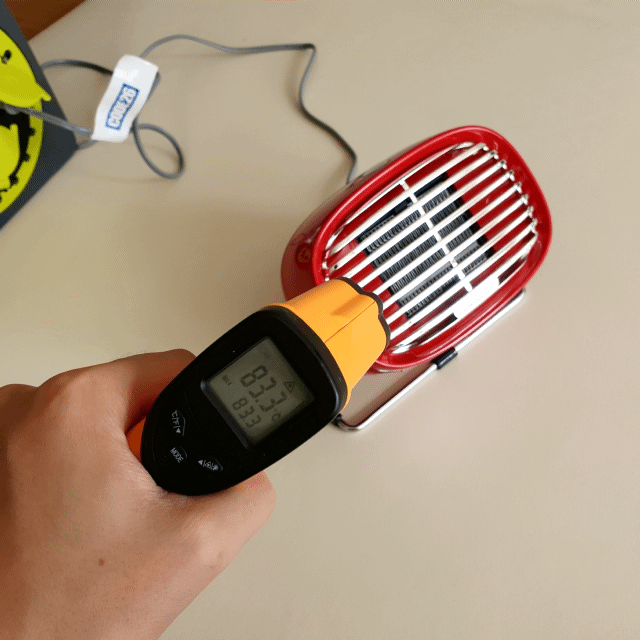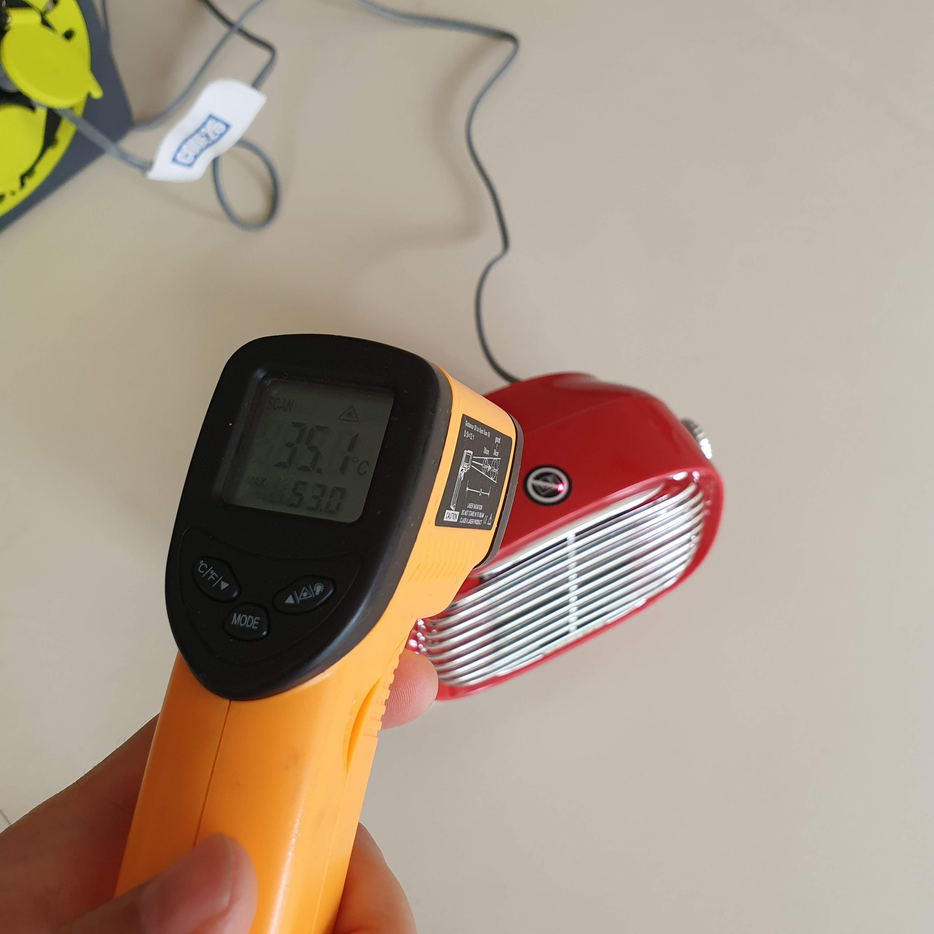 측정하는 부위에 따라서 약간씩 차이는 있습니다. 조금 더 뜨거운 부위가 있고 그렇지 않은 부위가 있습니다만 대체적으로 120~150도 정도의 분포로 온도가 유지됩니다. 송풍구 쪽이 이렇게 뜨거우면 위치를 옮기거나 켜고 끌 때 너무 뜨겁지 않을까 싶지만 한참을 켜놔도 송풍구를 제외한 나머지 면은 30도 중반의 온도로 약간 따뜻한 정도입니다.