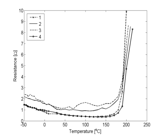 PTC에 대한 판매처의 설명자료입니다. 그래프가 조금 이상하긴 한데 350~450도 정도의 온도가 계속 유지된다는 걸 얘기하는 거 같네요. 온도가 조절되는 원리는 PTC라는 이름에서 알 수 있듯 온도가 바뀌면 전기 저항계수가 달라져서 발열량이 조절되는 효과가 나타나는 겁니다. 아래 그래프는 PTC의 특성 곡선인데요. 정말 신기하게도 특정 온도가 넘어서는 순간 마치 스위치를 차단하는 것처럼 저항이 급격히 올라가는 걸 알 수 있습니다.