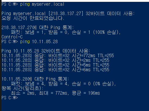 그런데 문제가 한 가지 있습니다. 아래 화면의 PING 테스트 결과를 보시면 IP주소로 핑을 보내면 응답이 있는데 이상하게 도메인명으로 핑을 보내면 응답이 없습니다.