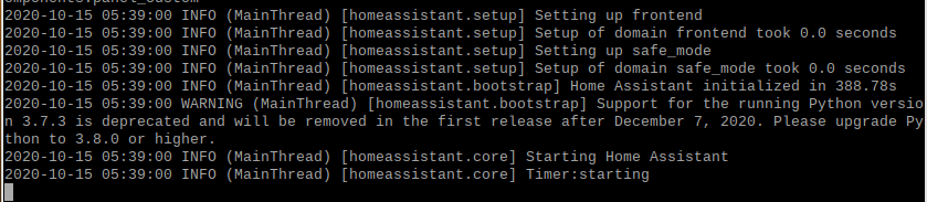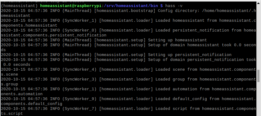 "hass"로만 실행하면 뒤에서 무슨 일이 벌어지고 있는지 잘 모르기 때문에 실행 로그를 자세하게 남기는 옵션인 -v를 추가해서 "hass -v" 명령으로 실행하고 기다렸습니다.