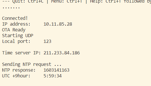 Serial.print("Time server IP:\t"); // NTP 접속정보 표시