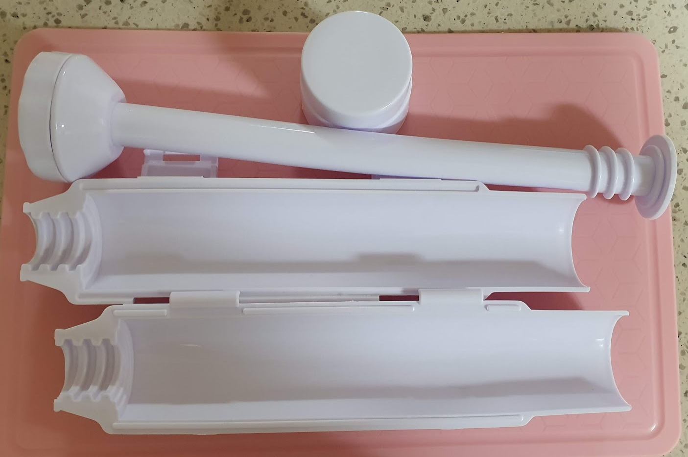 제품은 플라스틱 재질로 만들어져있고, 김밥 모양을 만들어주는 통이 좌우로 분리되도록 되어있고 김밥을 밀어주는 중간봉과 뚜껑으로 구성되어 있습니다. 홈페이지에 제품 이름에 바주카라는 단어가 들어가 있었는데, 중국어 혹은 영어를 한글로 번역하는 과정에서 나온 재미있는 결과물이겠지만 생긴 게 바주카 같기도 합니다.