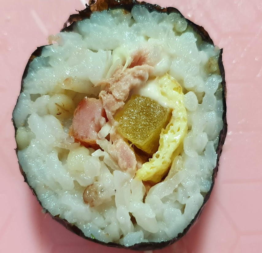 김밥에 밥이 7할은 되 보이는데 이걸 김밥이라고 해야 할지 주먹밥이라고 해야 할지... 해외출장 갔다가 공항에서 배가 고파서 어쩔 수 없이 먹었던 오이 달랑 한 줄 들어있던 롤이 생각나네요.