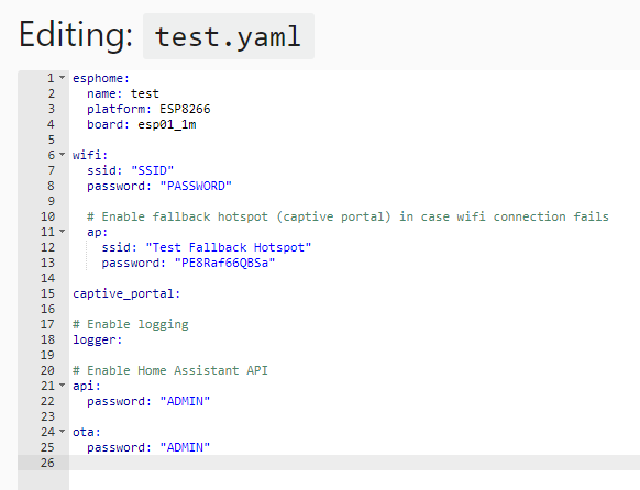 앞서 입력한 초기 설정값을 바탕으로 yaml파일이 만들어져 있는데요. 여기에 우리가 릴레이를 컨트롤할 핀의 기능을 추가해 줍니다. 6~13행이 추가된 코드인데, 한마디로 스위치라는 요소와 연결해서 눌려질 때마다 GPIO0핀의 상태를 HIGH, LOW로 왔다 갔다 하게 한다는 겁니다. 그리고 11행에 "inverted"라는 설정이 있는데 제가 사용하는 ESP01-realy모듈이 HIGH상태에서 릴레이가 ON이 아니라 OFF 상태가 돼서 로직을 뒤집어주기 위해서 추가되었습니다.