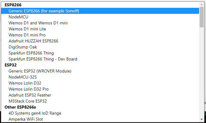 그리고 디바이스의 종류를 지정해주어야 하는데 정말 다양한 모듈을 목록에서 선택할 수 있습니다. 가장 비슷한 타입을 선택하면 되는데 웬만하면 Generic ESP8266으로 커버될 것 같네요.