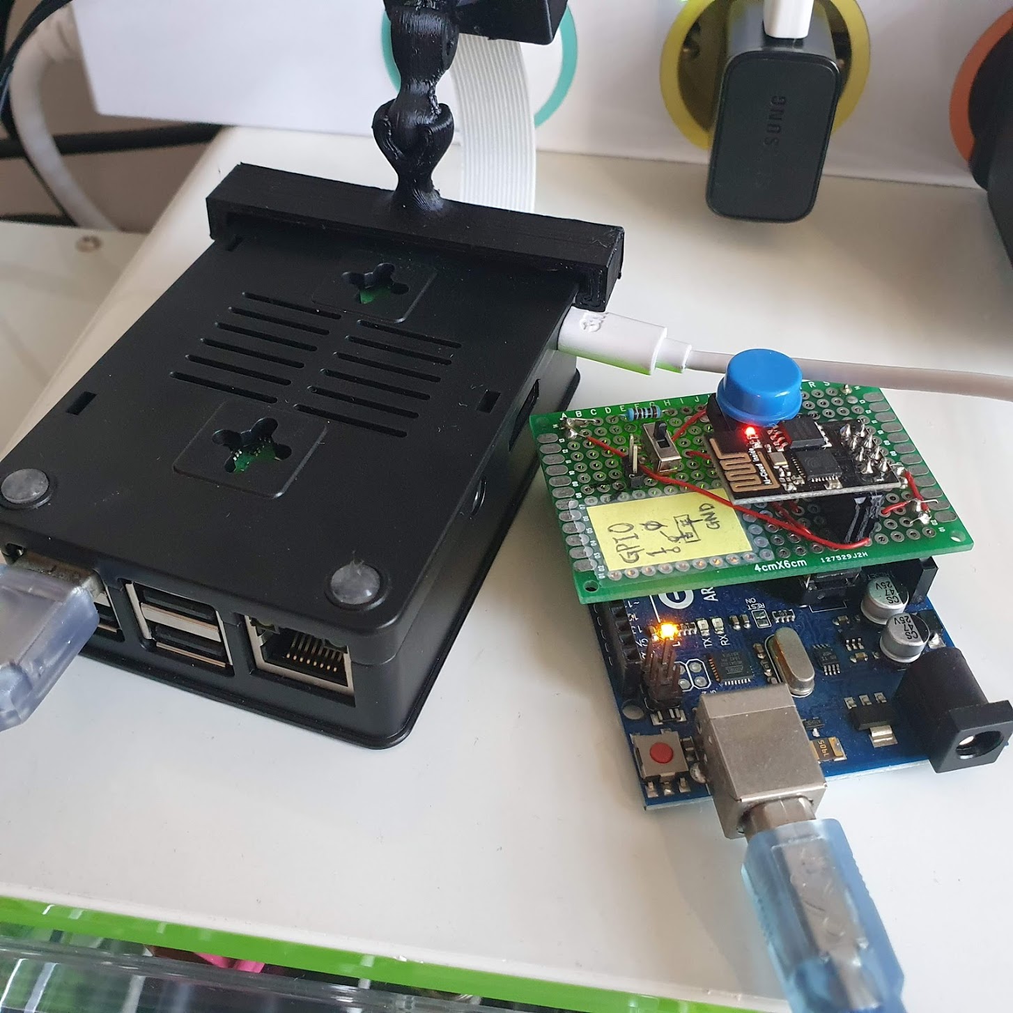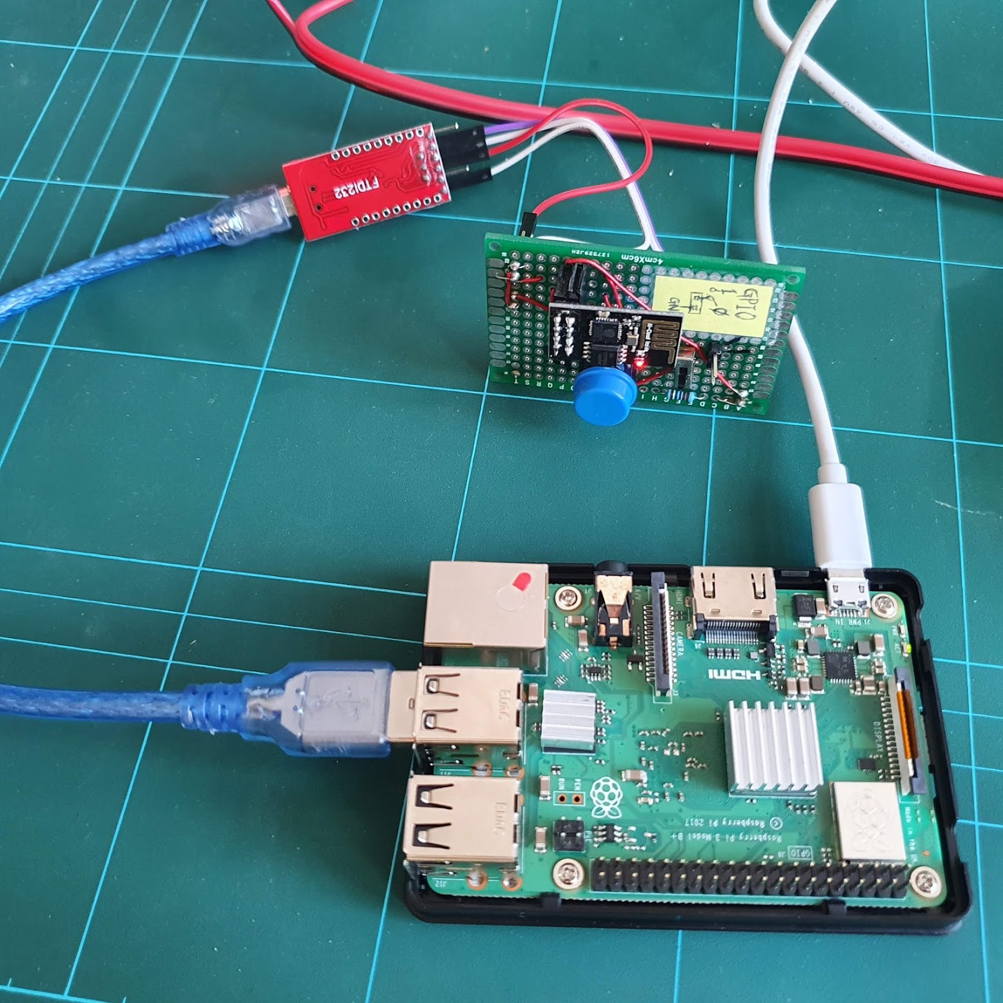 전 아두이노 우노에 보드에 붙여서 쓸 수 있도록 ESP01용 업로드 실드를 만들어서 쓰고 있었는데요. 이상하게 아두이노 우노 보드를 이용했을 때는 라즈베리파이가 저전압으로 멈추는 바람에 뭔가를 할 수가 없었습니다. 아마 제가 사용하고 있는 라즈베리파이 전원 아답타가 일반 핸드폰 충전기라서 전압이 5V 아래로 설정이 되어 있어서 그런 게 아닌가 싶습니다. 평소에도 저전압 경고가 많이 있었거든요. 라즈베리파이에 외부 전원도 연결해보고 했는데 해결이 안 돼서 이건 포기하고 USB브릿지를 다른 걸로 바꿨습니다.