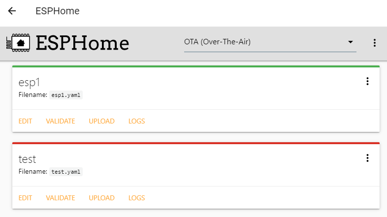 이렇게 하면 ESPHome UI에 새로 추가한 디바이스가 표시되는데요. test라는 이름이 추가되었습니다. 박스 윗면에 붉은색 줄이 있는데 연결되지 않았다는 표시입니다. 아직 펌웨어가 올라가지 않았으니 연결이 안 되겠죠. 제가 이미 만들어서 사용 중인 esp1 디바이스는 연결이 되어 있는 상태라서 박스 윗줄이 녹색임을 알 수 있습니다.