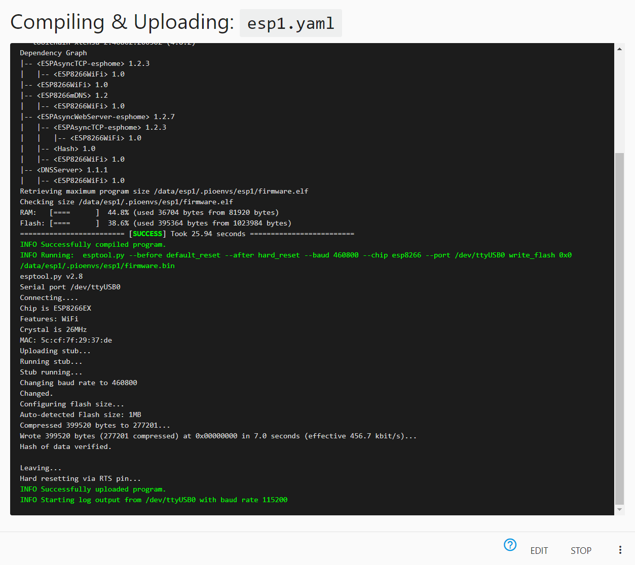 잠시 뒤 ESPHome이 실행되면 하단의 버튼이 위와 같이 바뀌고 ESPHome을 사용할 준비가 끝났습니다.
