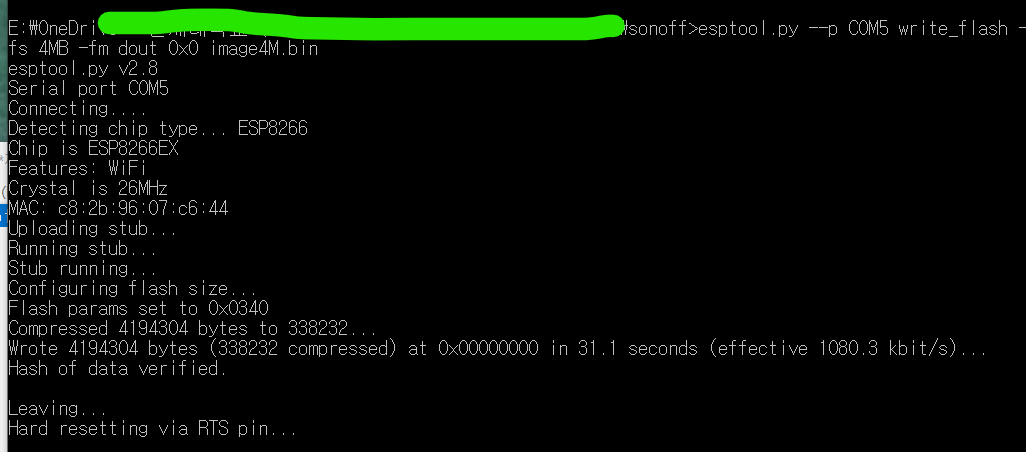 이제 백업된 펌웨어를 다시 올려보겠습니다. 아래 명령어를 입력하기 전에 Sonoff가 프로그래밍 모드에 진입해 있는지 확인해주세요.