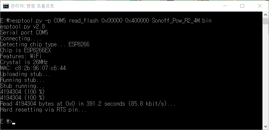 위 명령어를 입력하면 설치되어 있는 펌웨어를 내려받을 수 있습니다. 여기서 우리는 플래시 사이즈가 4MB란 걸 확인했으니 두 번째 주소 값 인자가 0x400000가 되었습니다. 마지막 인자는 내려받은 펌웨어를 저장할 때 사용할 파일명입니다. 적당한 이름을 지정하면 됩니다.