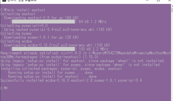 아래와 같이 후루룩~ 하면서 esptool이 알아서 설치됩니다.