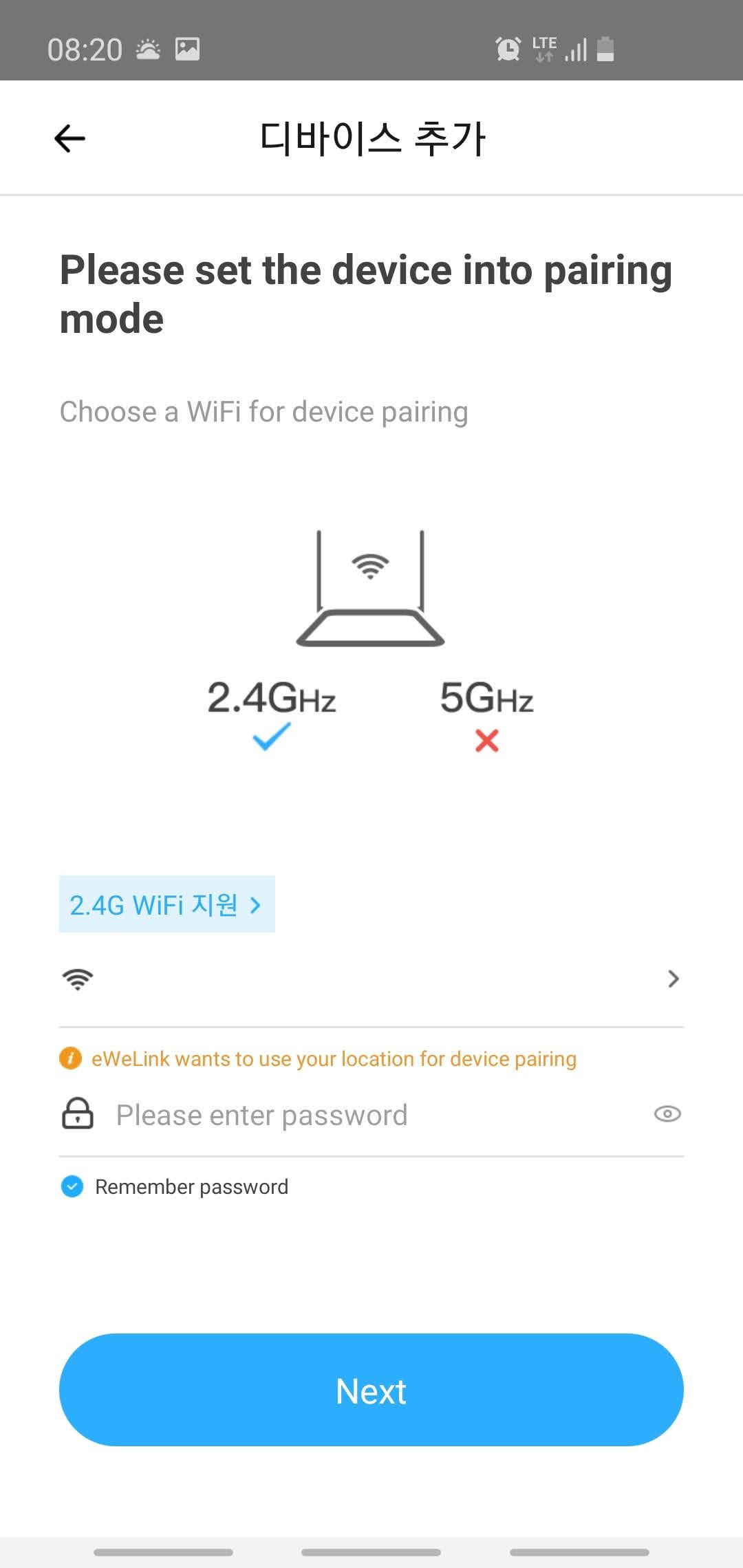 그리고 Add버튼을 눌러서 Sonoff Pow R2 를 추가합니다. 와이파이 네트워크를 연결하는 화면은 좀 헷갈리게 되어있는데 SSID를 직접 입력하는 게 아니라 현재 핸드폰이 연결된 네트워크를 자동으로 감지하도록 되어 있습니다. 그래서 Sonoff는 5 GHz 와이파이는 지원하지 않기 때문에 핸드폰을 2.4 GHz 주파수의 와이파이에 연결한 상태에서 진행을 해야 합니다. 전 여기서 어떻게 하는지 몰라서 한참을 헤매었어요. ㅠㅠ