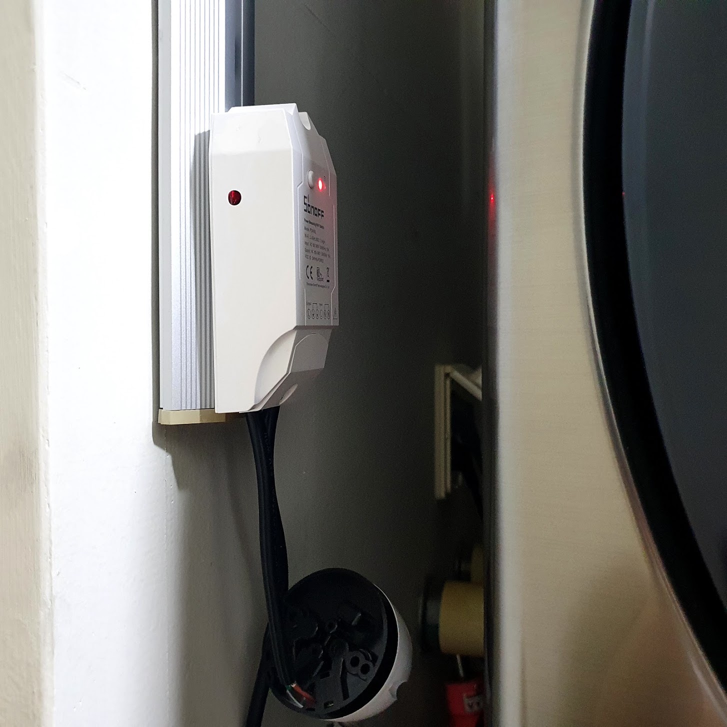 일단 Sonoff pow는 세탁기옆 콘센트 벽에 붙였습니다. 매번 느끼는 건데 선정리가 가장 어려워요.. 콘센트 길이를 너무 짧게 잡아서 어떻게 고정하지 못하고 달랑거리는 상태가 되었는데 나중에 선을 좀 더 길게 잡아서 옆에 다시 붙여줘야겠어요. 선 지저분하다고 또 한소리 듣게 생겼네요.