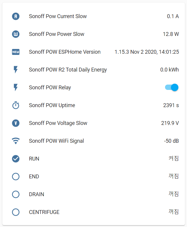 사용한 예제에서는 사용전력이 4W이상이면 RUN 상태가 활성화되고 15~60W는 DRAIN, 100~400W는 CENTRIFUGE 상태가 활성화되도록 프로그램되어 있습니다. 그렇다 보니 동작 상태가 겹치게 표시되기 때문에 "entity-filter"로만 표시하기에는 한계가 있습니다. 이 부분은 수정을 해야 할 것 같네요.