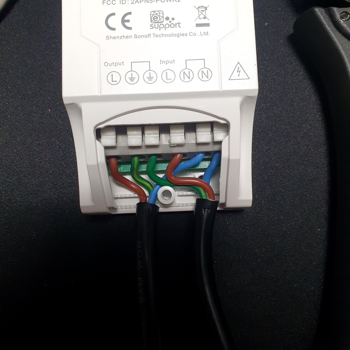 입력과 출력 각각 3개의 전선이 연결되는 구조입니다. 접지, 중성선(N), 활선(L)으로 구분되는데 접지는 녹색, 중성선은 하늘색, 활선은 갈색으로 맞추었습니다. 각 배선 위치는 직접 확인하시고 연결하는 게 좋은데 집마다 활선과 중선선의 위치가 다른 경우도 있다고 합니다. 그리고 Sonoff Pow가 동작하는데 접지가 꼭 필요한지는 확인해 보지 않았는데 세탁기에서 따로 접지를 하지 않고 있기 때문에 접지선까지 매뉴얼대로 잘 연결해 주었습니다.