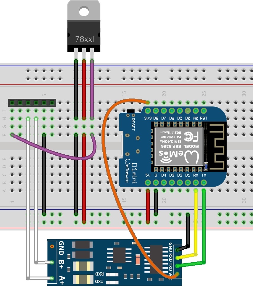 A+ = 흰파, B- = 파랑, VCC = 12V, GND = GND