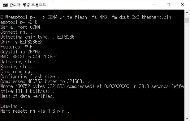 컴파일이 완료되었으면 esptool을 이용해서 펌웨어를 보드에 업로드합니다.