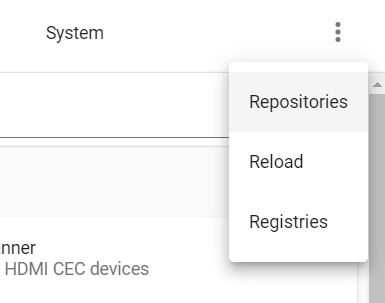 Add-on store에서 우측 상단의 메뉴에서 "Repositories"를 선택해서 새로운 저장소 주소를 추가합니다. (https://github.com/greays/hassio)