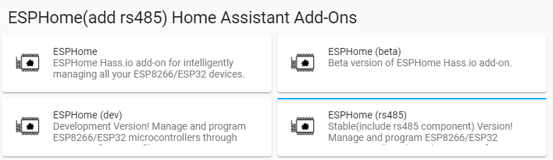 이제 RS485-WiFi 변환 모듈의 하드웨어가 완성되었으니 펌웨어 올려보겠습니다. 먼저 HA에 ESPHome Add-on이 설치되어야 하는데 Add-on store에서 기본적으로 찾을 수 있는 ESPHome이 아닌 다른 버전을 설치해야 합니다. 기본 ESPHome에는 RS485 컴포넌트가 포함되어 있지 않기 때문인데요.