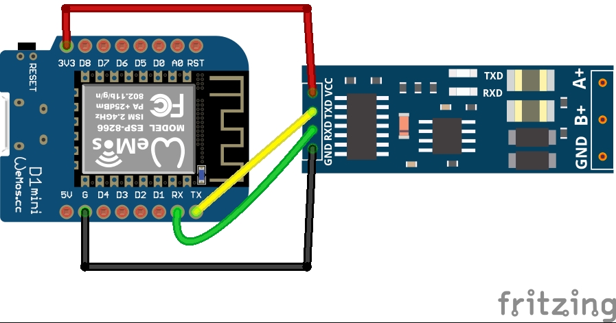 전 12V의 RS485통신 모니터링에 사용하기 위해서 5V/3.3V의 TTL신호를 12V로 변환시켜주는 RS485-TTL 변환 모듈을 준비해서 아래와 같이 연결했습니다. 여기서 변환 모듈의 A+, B+ 단자를 각각 신호를 읽어올 통신 단자에 연결해주면 되겠습니다.