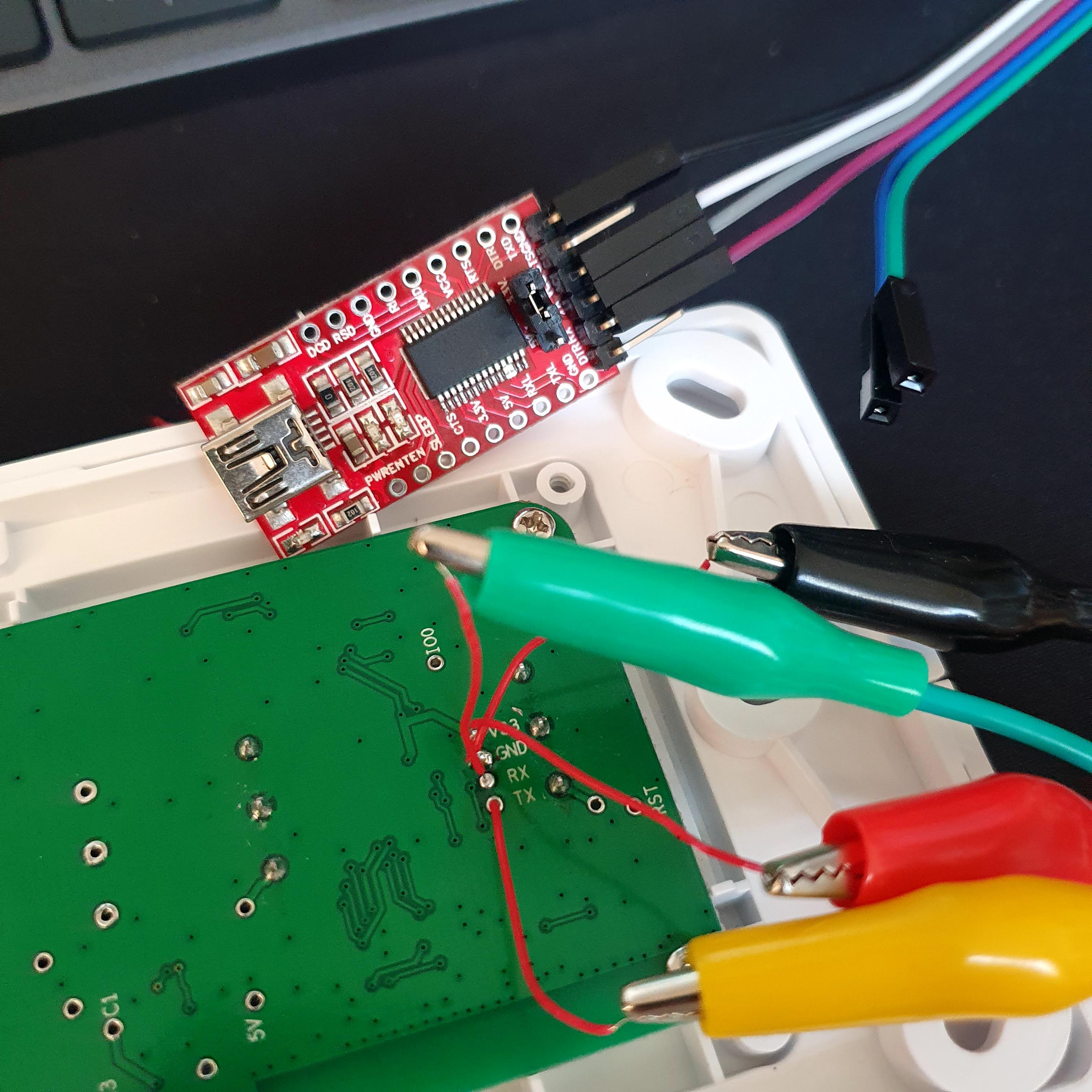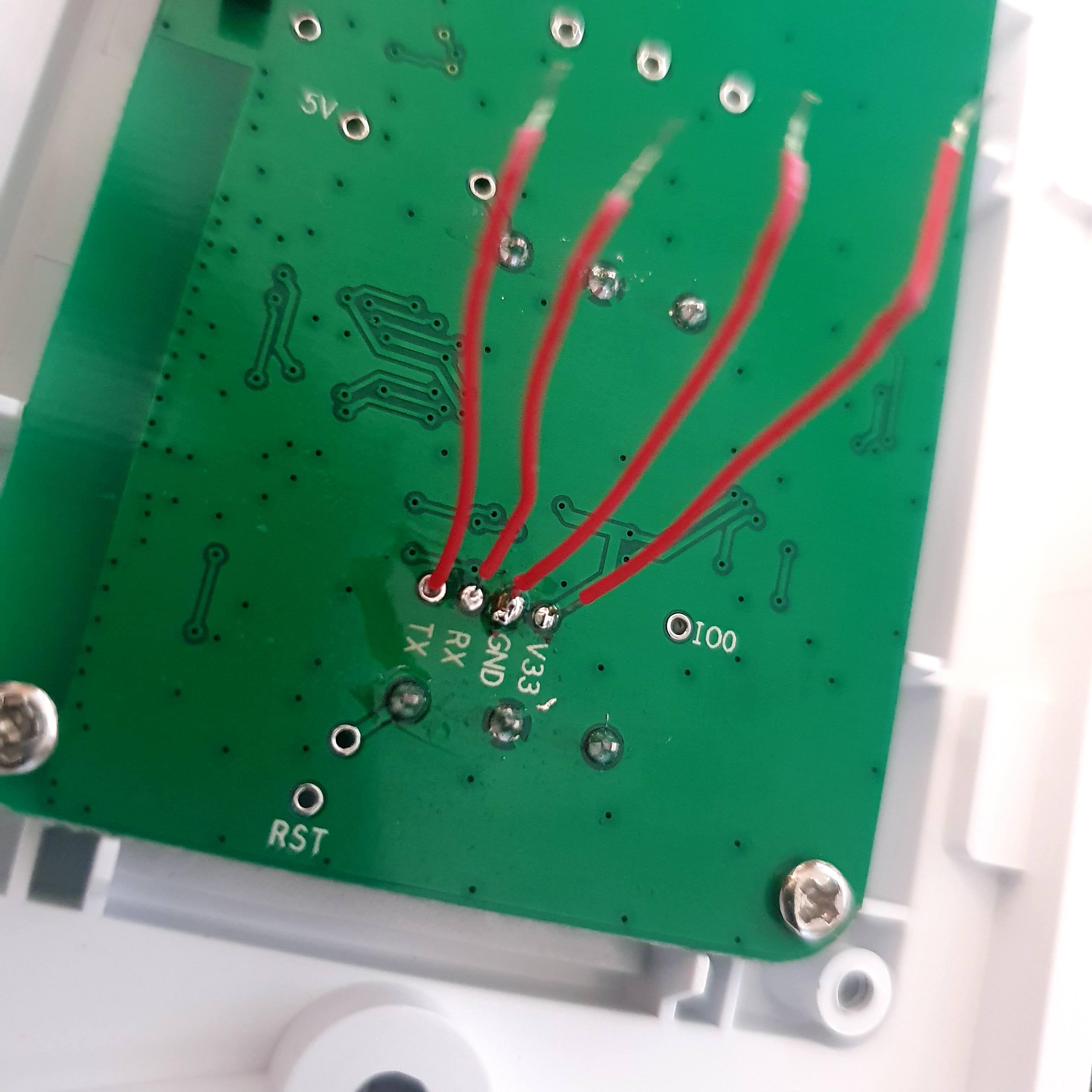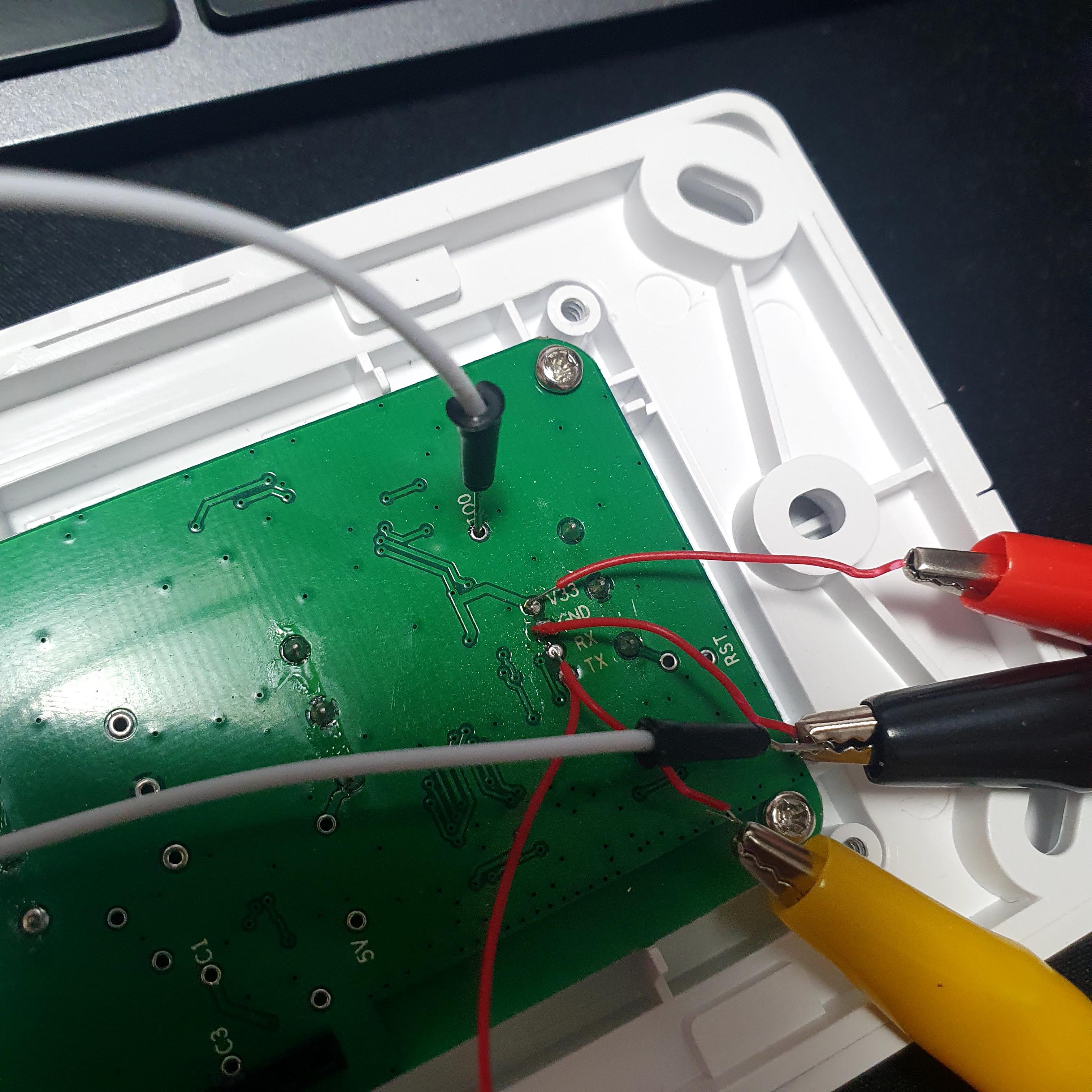 펌웨어를 교체해야 하니 유심히 봐야 할 부분은 바로 왼쪽의 컨트롤 보드입니다. 보드를 잘 살펴보면 고맙게도 Rx, Tx 그리고 3.3V 전원 단자가 마킹되어 있습니다. 이 부분에 USB to UART 보드를 연결하면 될 것 같고 비슷한 방법으로 Sonoff 제품 펌웨어를 몇 번 만져봤더니 좀 익숙한 느낌이어서 바로 원래 있던 펌웨어 백업 진행해 봤습니다.