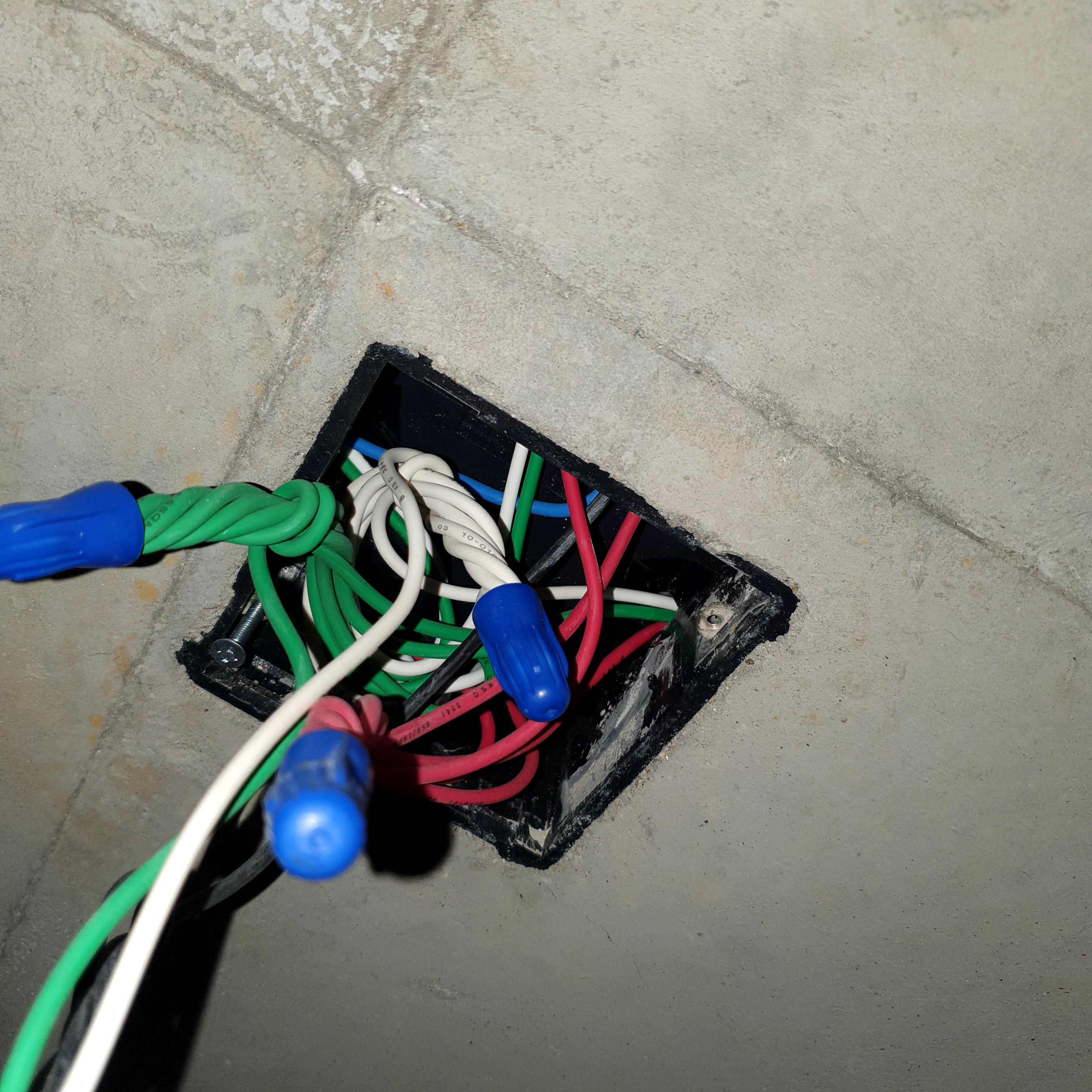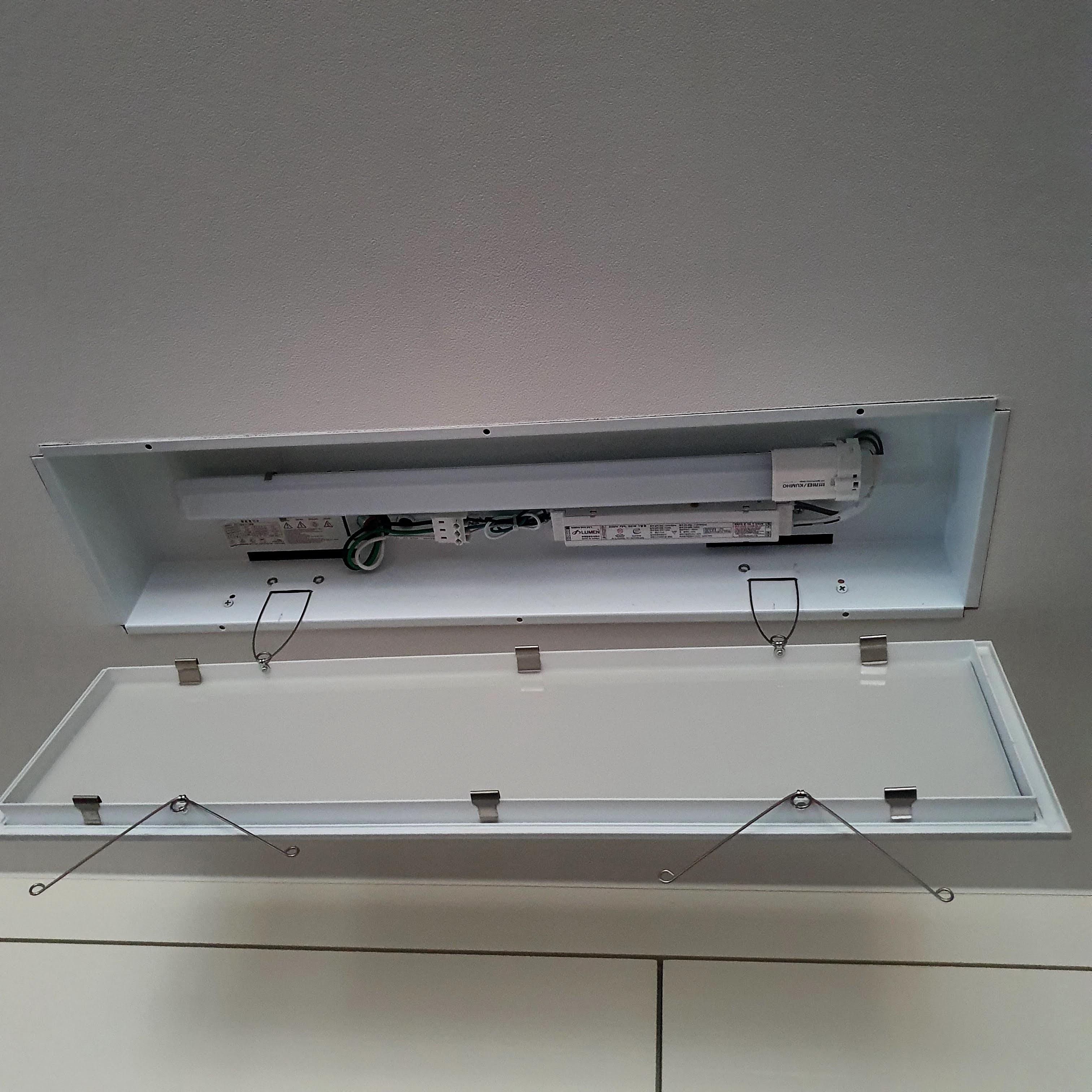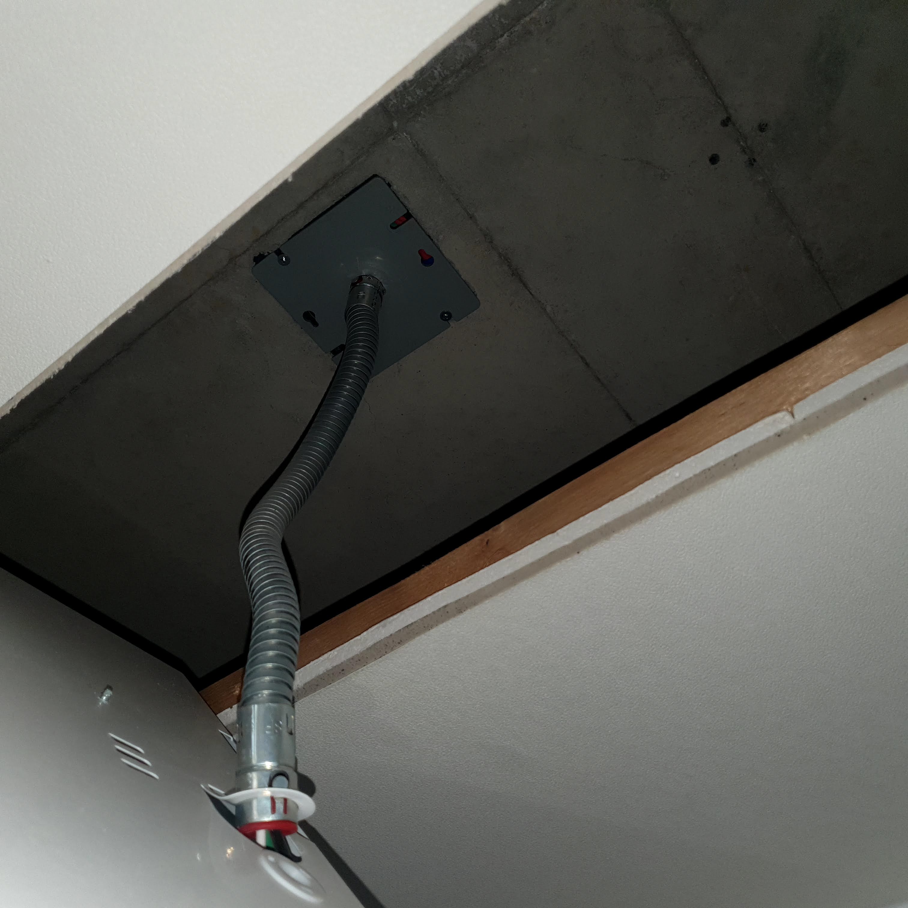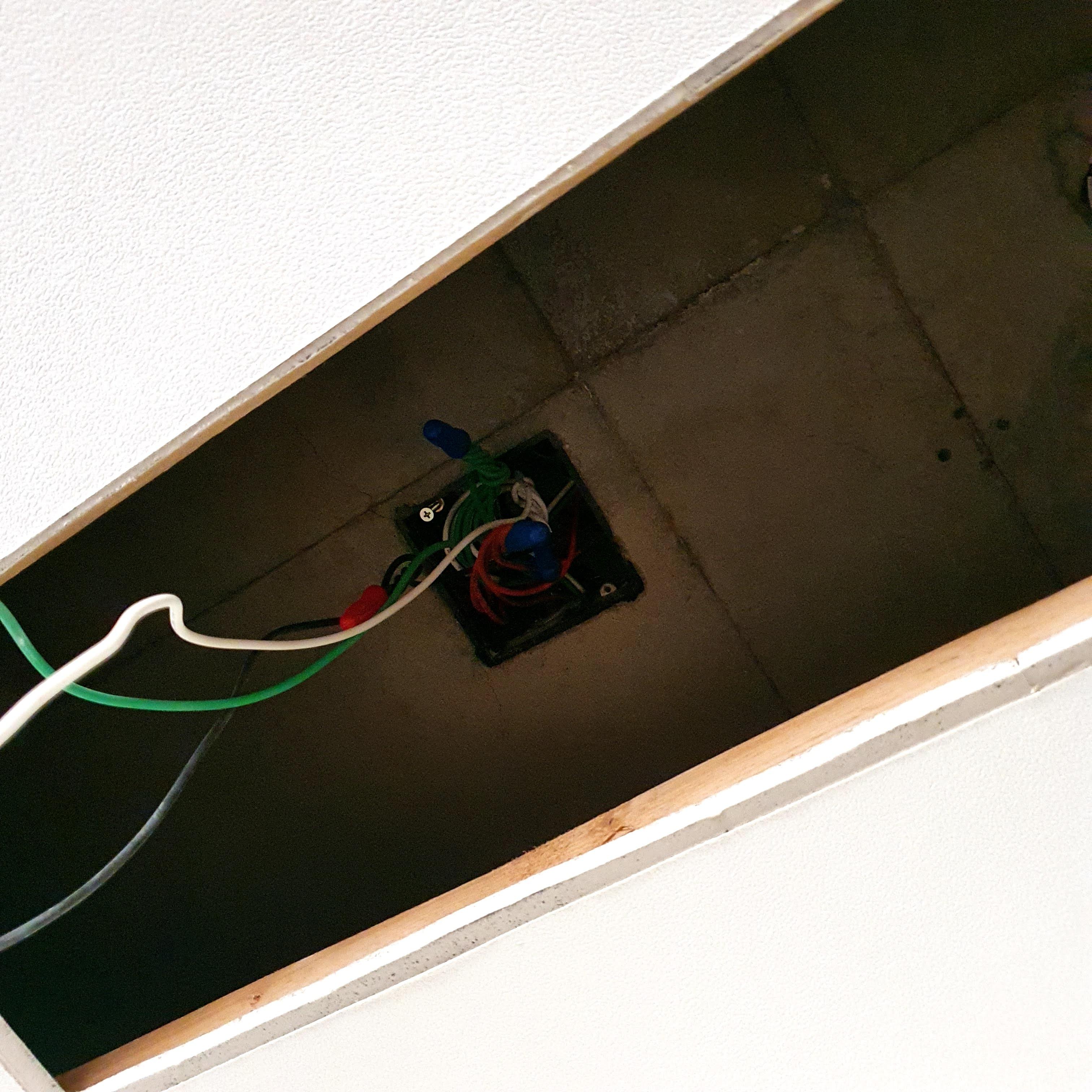 작업해야 하는 구간은 위 사진과 같습니다. 벽에 설치된 스위치에서 벽 따라 올라간 다음 천장 따라 약 1m 이내의 짧은 거리에 있는 전등까지 매립 구간입니다. 전등은 천장에 이런 식으로 매립되어 있는 형태인데 커버를 열어보면 내부에 활선, 중성선, 접지선 3가지 종류의 와이어가 연결되어 있는 걸 볼 수 있습니다.