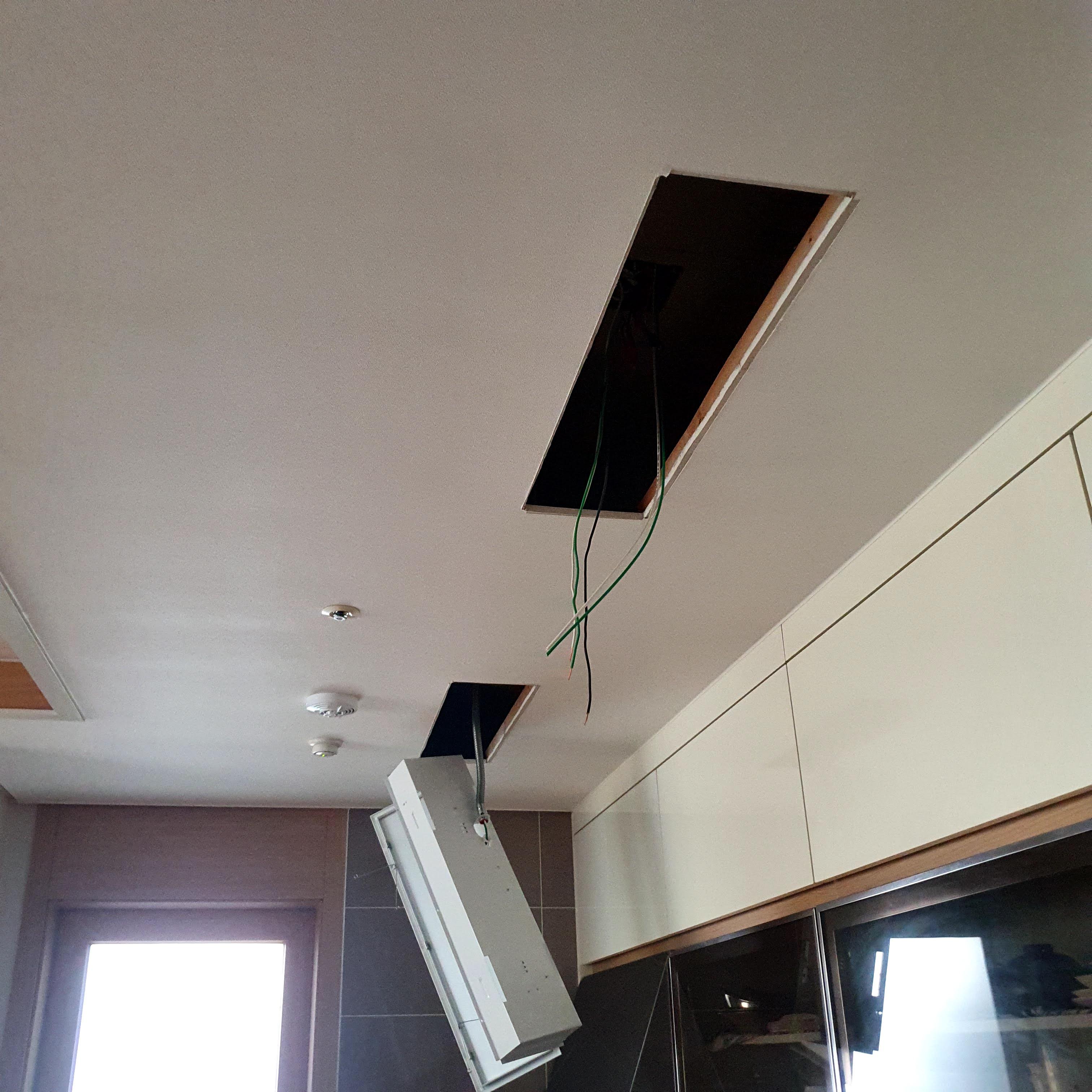 본격적인 작업을 위해서는 설치된 전등 뭉치를 완전히 제거해 주어야 합니다. 왜냐하면 각 전등까지 개별의 전선관들이 연결된 방식이 아니라 전선관은 천장 콘크리트 안쪽에 매립되어 있고 전등이 설치되는 위치 위치마다 교차로처럼 전선관들이 모여드는 구간이 있는데 바로 이 부분까지 접근을 해야 선 매립작업을 할 수 있거든요.
