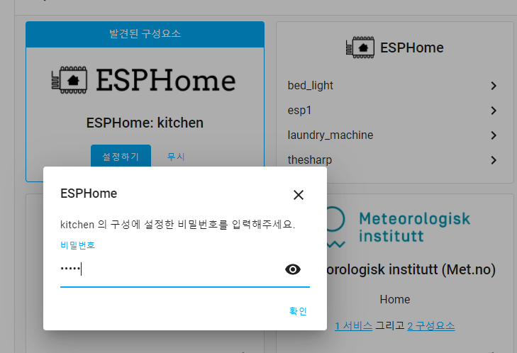 여기까지 하면 이제 교체할 스위치 준비가 끝났습니다. 펌웨어가 올라가고 나서 잠시 기다리면 HA에서는 새로운 구성요소의 발견 알림이 뜨고 여느 ESPHome 디바이스처럼 인식을 하게 됩니다.