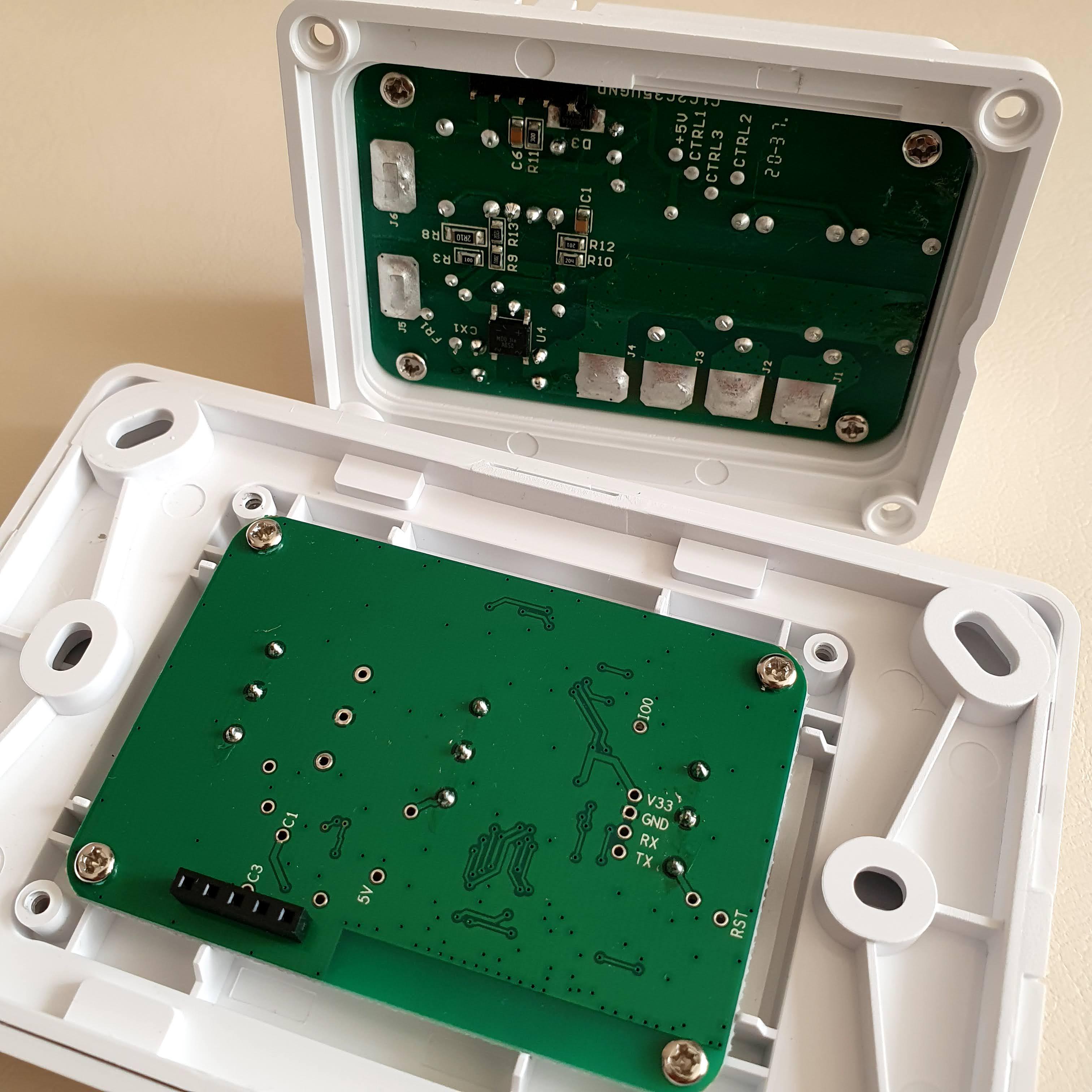 왼쪽 사진이 ESP8266과 스위치가 있는 컨트롤 보드이고 오른쪽 보드에는 릴레이 및 정압기(?)등이 위치하고 있습니다.