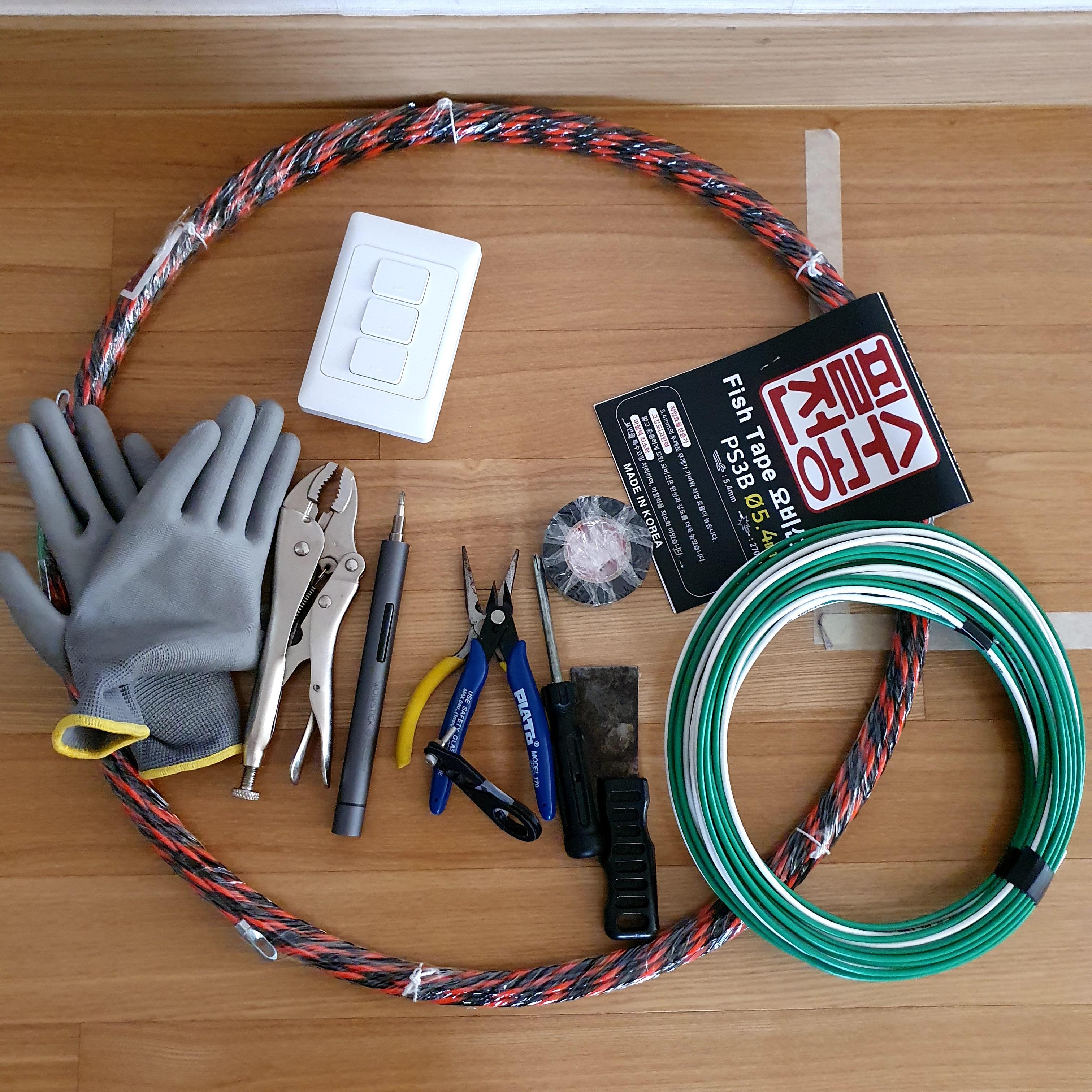 중선선 매립 관련해서 일단 유튜브 영상 보면서 공부를 좀 했는데요. 몇 가지 준비물이 필요했습니다. 가장 중요한 게 요비선이라고 부르는 빳빳한 와이어인데, 전선관을 따라서 쑥쑥 밀어 넣을 수 있고 반대편에서 매립하고자 하는 전선을 연결해서 다시 뽑아내는 과정을 통해 전선 매립 작업을 하게 해주는 그런 공구입니다. 그 외에도 전선, 절연 테이브, 니퍼, 등등 필요했습니다.