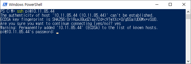 먼저 라즈베리파이가 접속되어있는 네트워크에 포함되어 있는 윈도에서 파워쉘이나 명령 프롬프트를 열어줍니다. 그리고 라즈베리파이가 접속하고 있는 IP주소를 확인한 뒤 다음과 같이 SSH접속을 해 줍니다.