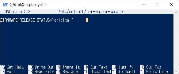 만약 펌웨어 버전을 critical이 아니라 stabe이나 좀 더 최신의 펌웨어로 바꿔서 적용하고자 한다면 nano편집기를 사용해서 "/etc/default/rpi-eeprom-update" 내용을 수정합니다.