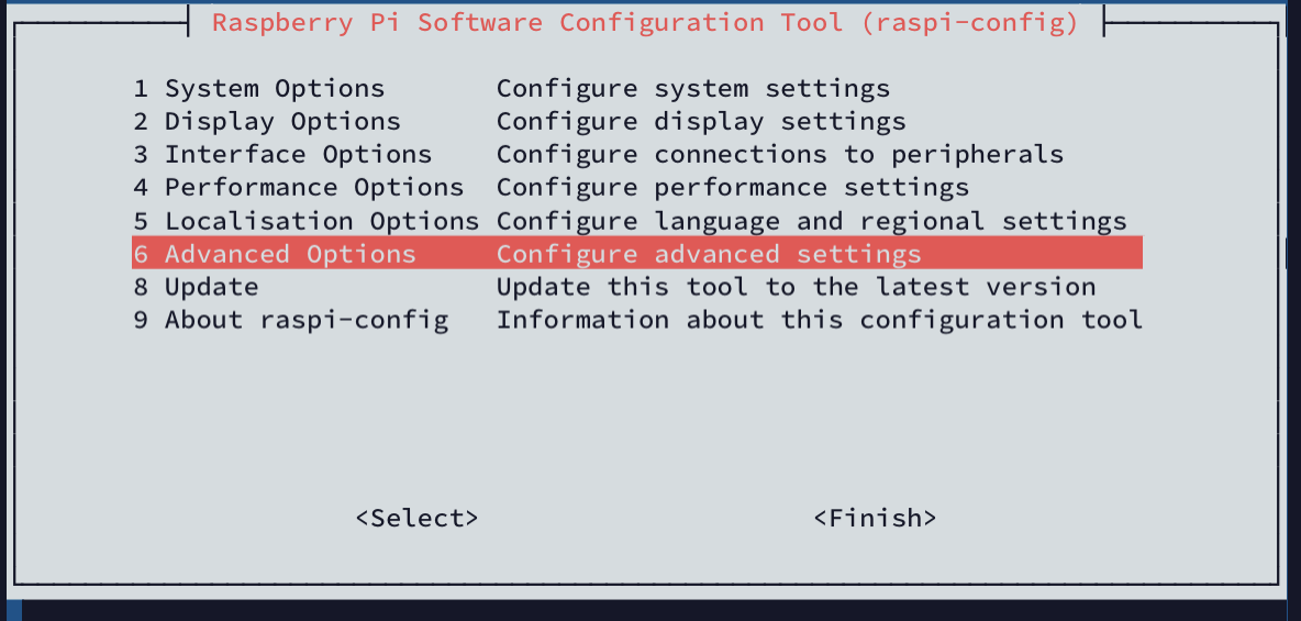 라즈베리파이 설정툴을 열어서 6번 Advanced Options으로 들어갑니다.