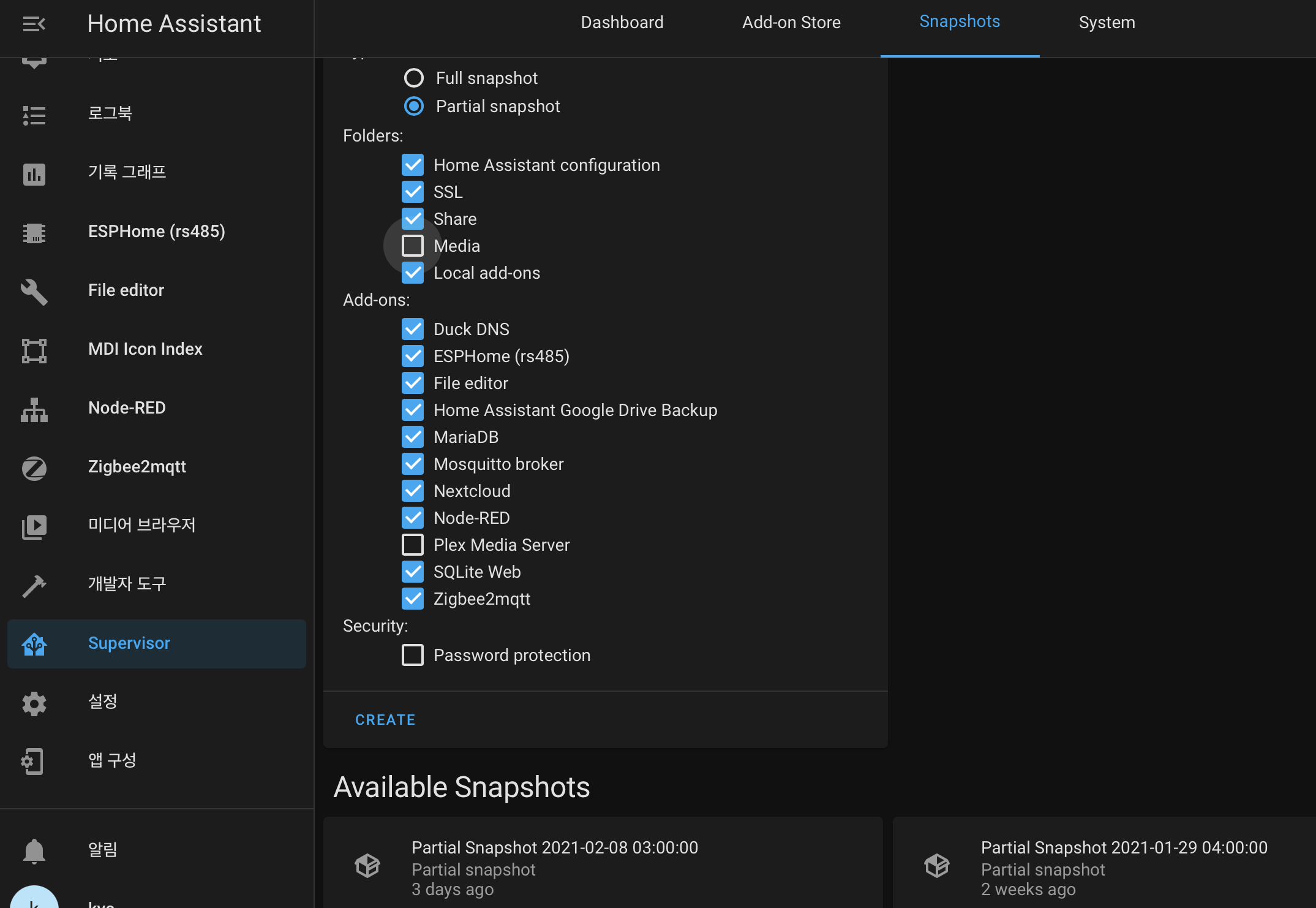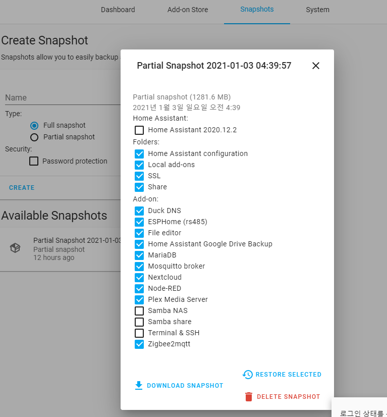 마이그레이션 시작하기 전, 가장 먼저 해야 할 부분은 바로 기존 설정의 백업본을 만드는 거죠. HA에서는 스냅숏이라고 부르는데 각종 설정 및 사용자 데이터를 모두 백업할 수 있습니다.