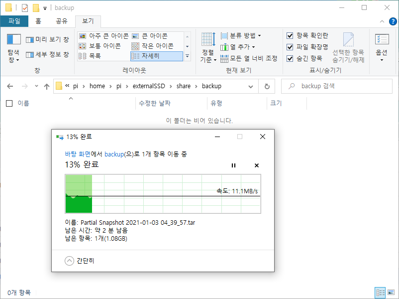 삼바 서버까지 준비가 되었으면 PC에서 삼바 서버로 접속하고 스냅숏 로딩 위치에 준비해둔 파일을 복사합니다. HA에서 스냅숏 파일이 저장되는 위치는 "share/backup"입니다.