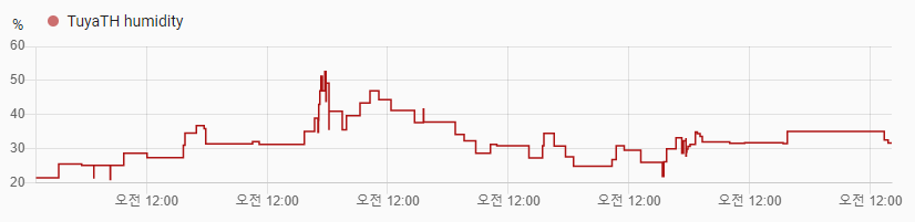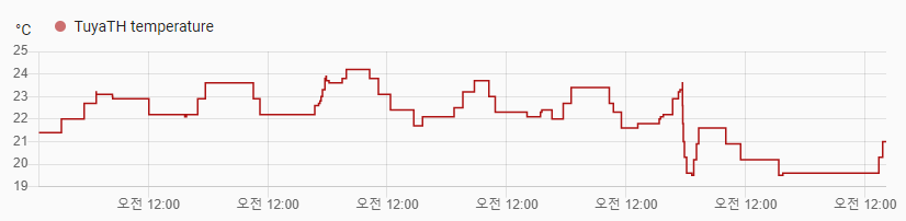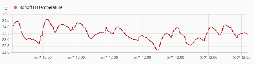 별도로 리뷰 작성계획인 Sonoff제품과 비교해보면 그 차이를 볼 수 있는데요. 아래 Sonoff 제품의 온도 측정 그래프는 측정 간격도 일정하고 빈도도 변화를 확인하기에 충분히 짧게 유지되는 걸 볼 수 있습니다.