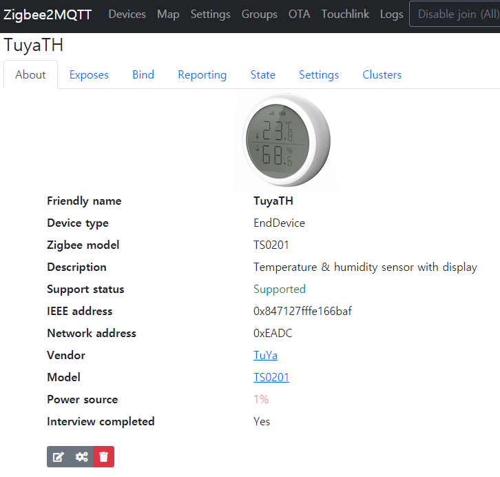 Home Assistant에 설치된 Zigbee2MQTT에서 인식한 모습입니다. 배터리 잔량 및 전압, 온도, 습도, 연결 강도 5가지 값을 확인할 수 있습니다. 연결 잘되고 측정값 잘 올라옵니다.