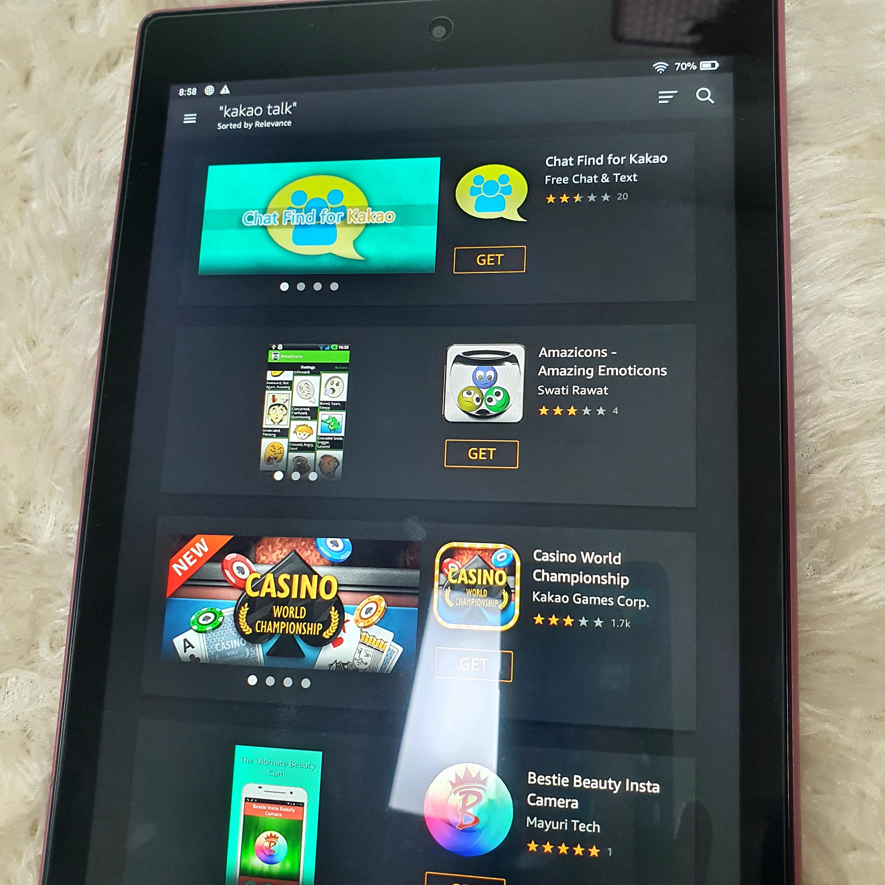 초기 부팅이 끝나고 런쳐가 실행되면 온통 아마존 관련 앱들이 잔뜩 깔려있는 걸 볼 수 있습니다. 한두 게 말고는 사용해 본 적도 없는 처음 보는 앱들입니다. 그리고 앱스토어도 아마존 향 전용 앱이 있는데요. 한국에서 필수 앱이라고 할 수 있는 카카오톡도 찾아볼 수 없는 무용지물의 스토어입니다.