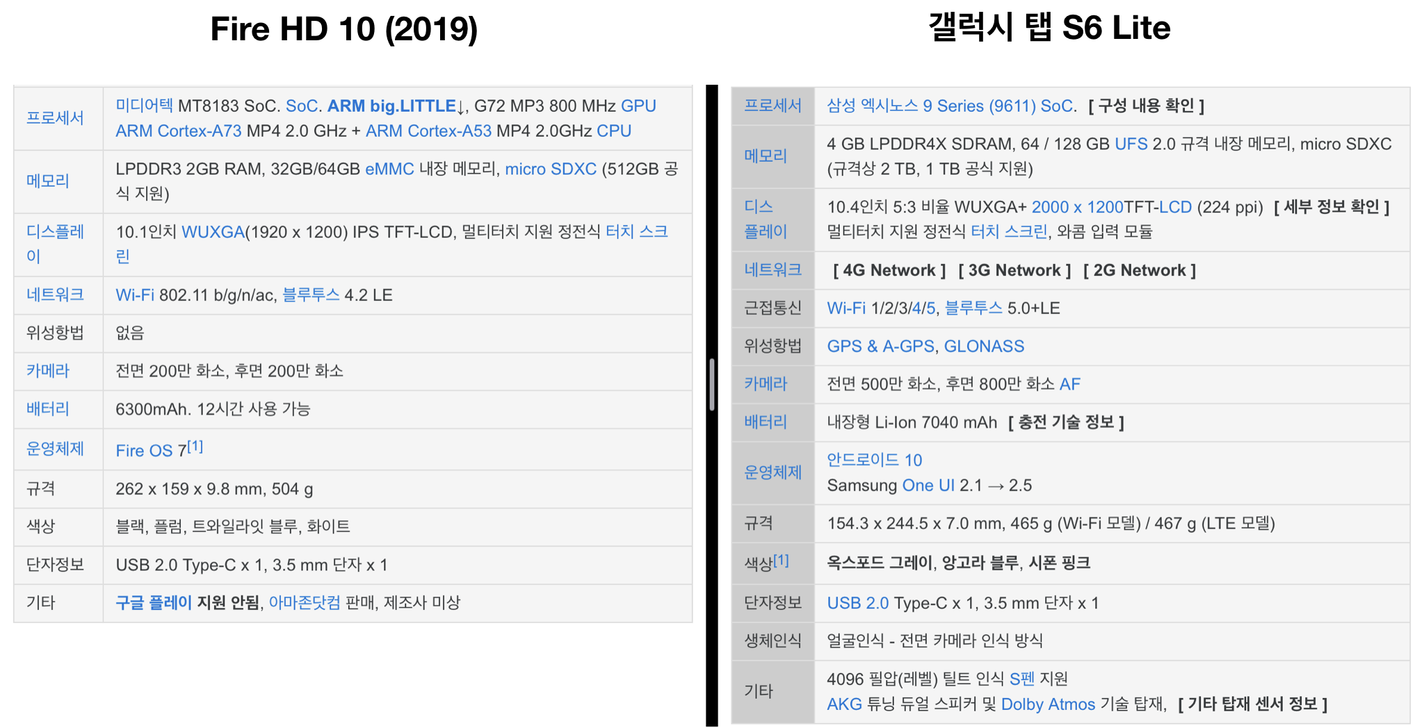 반면 Fire HD는 안드로이드 기반이긴 하지만 FireOS라는 별도의 운영체제가 올라가 있고 최적화 면에서도 아쉬운 부분이 있으며 메모리도 2기가에 불과한 등 부족한 하드웨어 스펙 때문에 생산성 작업을 하기에는 미흡한 디바이스입니다. 하지만 콘텐츠 소비용으로써는 충분한 성능을 보유하고 있으며 10만 원도 안 하는 매우 저렴한 가격으로 인강이나 어린이용 태블릿으로는 굳건한 포지션을 확보하고 있다 할 수 있습니다.