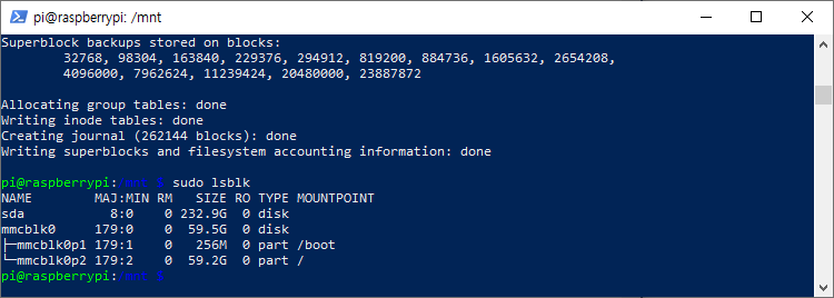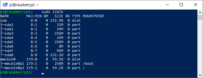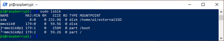 먼저 라즈베리파이 SSD를 연결했다면 SSD 드라이브를 잘 인식하고 있는지 확인합니다. "sudo lsblk"명령어를 사용합니다.