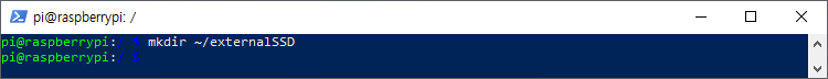 이제 라즈베리파이에서 SSD가 자동으로 마운트 될 수 있도록 해 주겠습니다. 먼저 SSD가 마운트 될 폴더를 만들어 줍니다. 경로는 "/home/pi/externalSSD/"입니다.