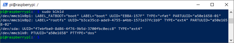 다음으로, 연결된 SSD의 UUID를 확인합니다. "sudo blkid"명령을 사용합니다.