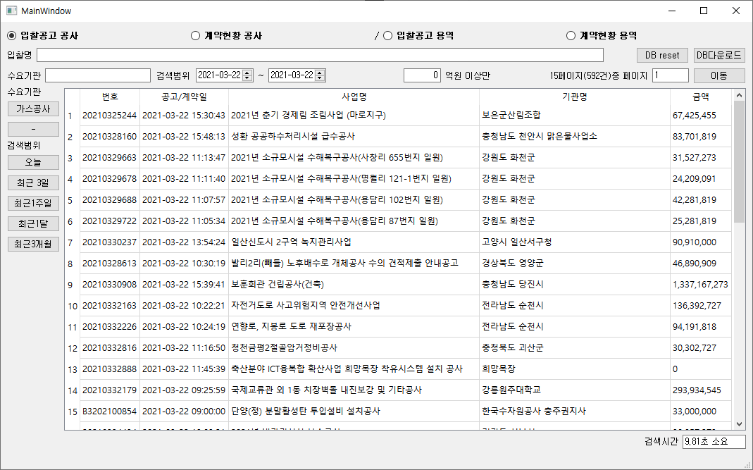 | 조달청 입찰/계약 정보 조회용 프로그램 (1/ 2) - 공공데이터포탈 API 분석 및 GUI구성 (13) | 2021.03.19 |