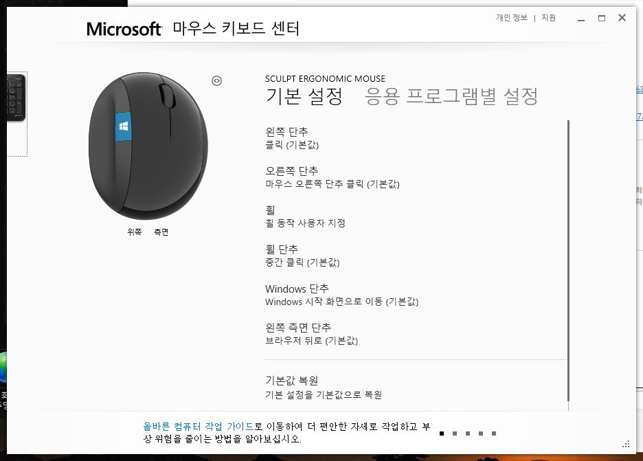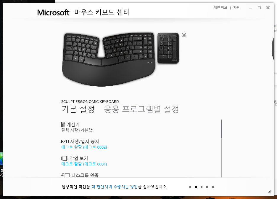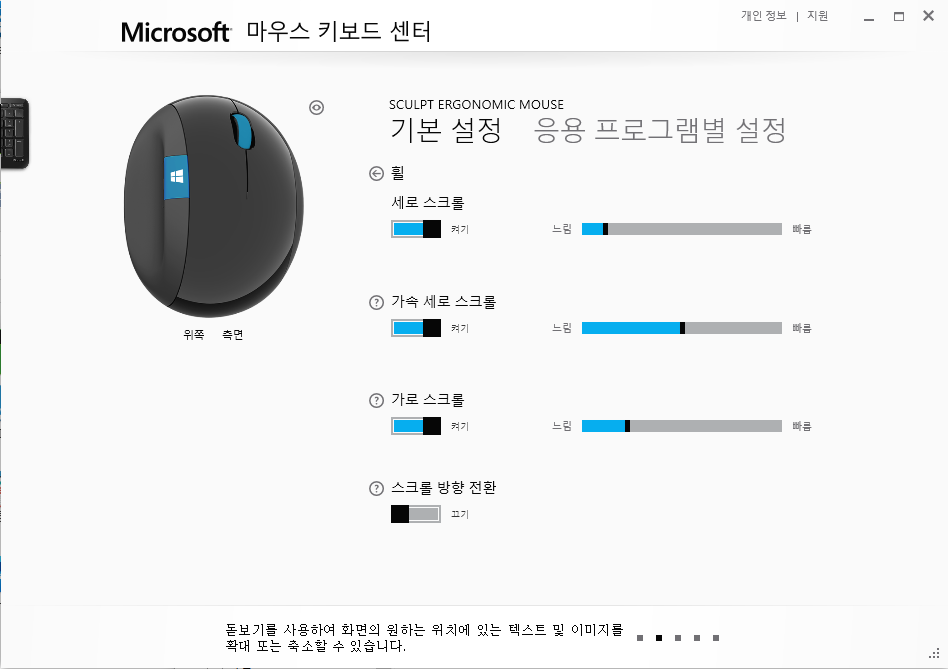 얼마 전에 "마우스 및 키보드 센터"라는 MS 제품용 보조 프로그램을 알고 설치해 봤는데 위에 언급한 아쉬운 점들이 이유가 있었고 그리고 어느 정도 소프트웨어적으로 보완이 가능한 것들이었습니다.