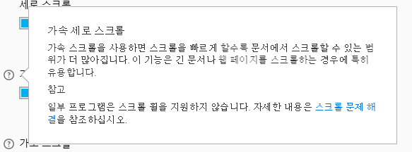 이 프로그램을 설치하게 되면 마우스 휠 동작에 새로운 기능이 추가되는데요. 제가 가장 맘에 드는 건 바로 "가속 세로 스크롤" 기능입니다. 스크롤을 천천히 하게 되면 위에 있는 "세로 스크롤"에 설정된 속도로 동작하지만 빠르게 반복적으로 스크롤하게 되면 두 번째 가속 세로 스크롤 속도로 동작을 하게 되는 거죠. 그리고 제가 느끼기에 반복적인 동작에서는 그 속도가 더 빨라지는 것 같았습니다.