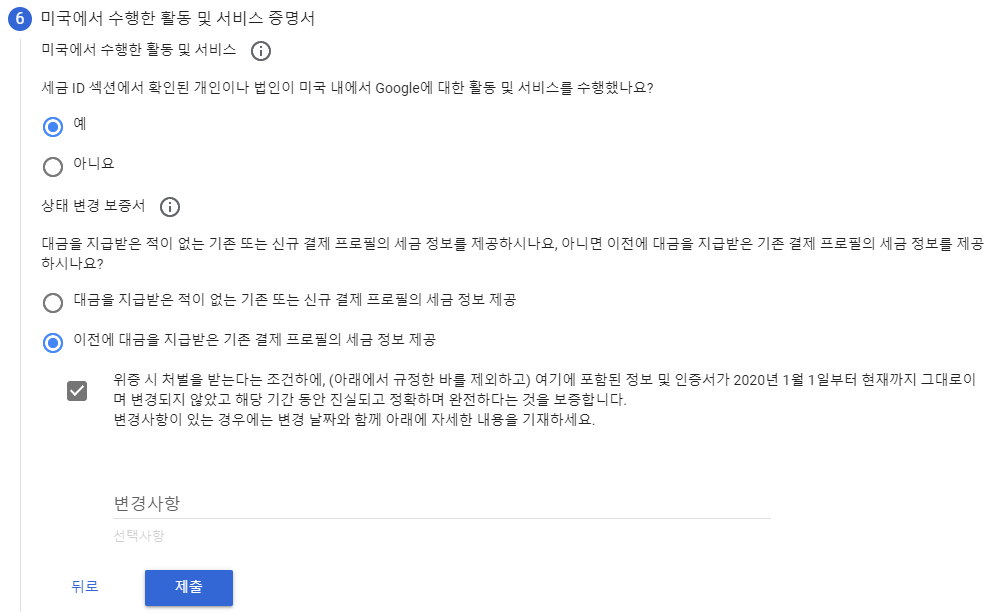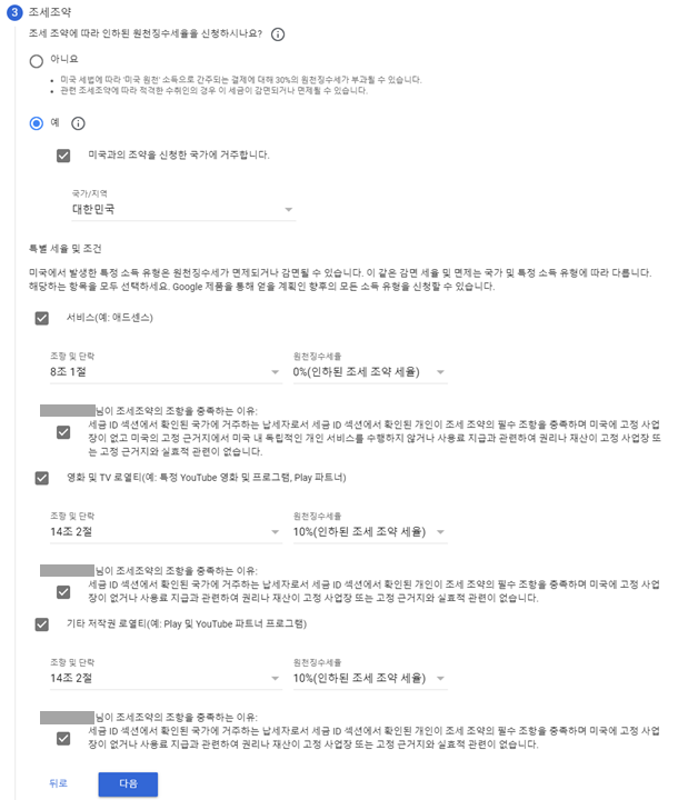 조세 조약에 따라 인하된 세율을 신청하는 부분입니다. 거주 국가를 선택하고 조건을 입력합니다. 저는 애드센스만 받고 있지만 하는 김에 일단 다 신청했습니다.